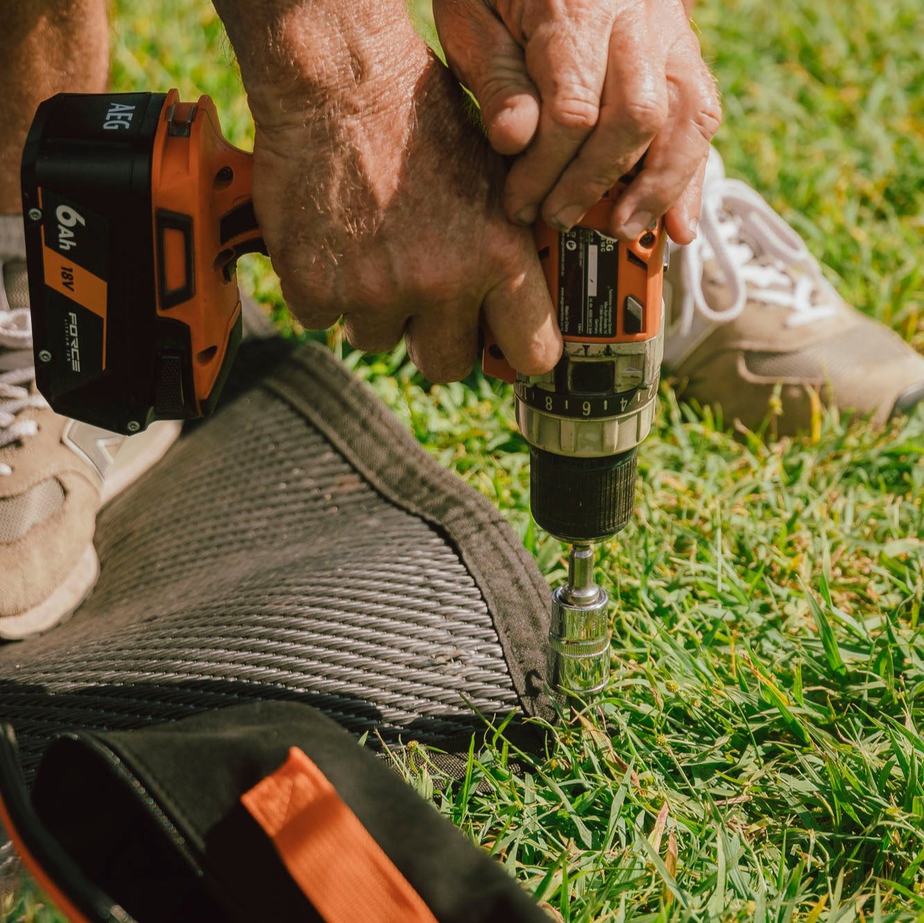 Compatible with standard 19mm drill sockets, Ground Puppy Pegs make setup fast and easy, allowing you to secure mats in seconds with just a drill or hand crank.