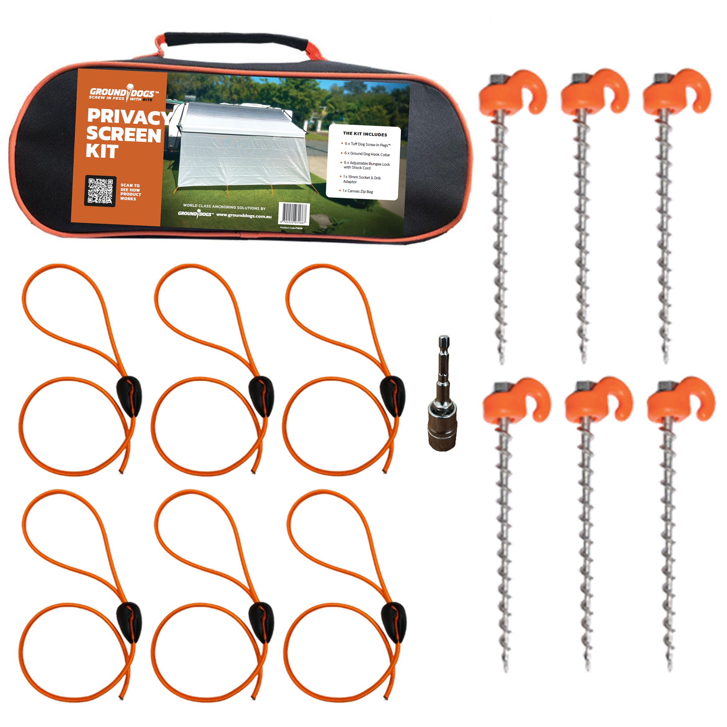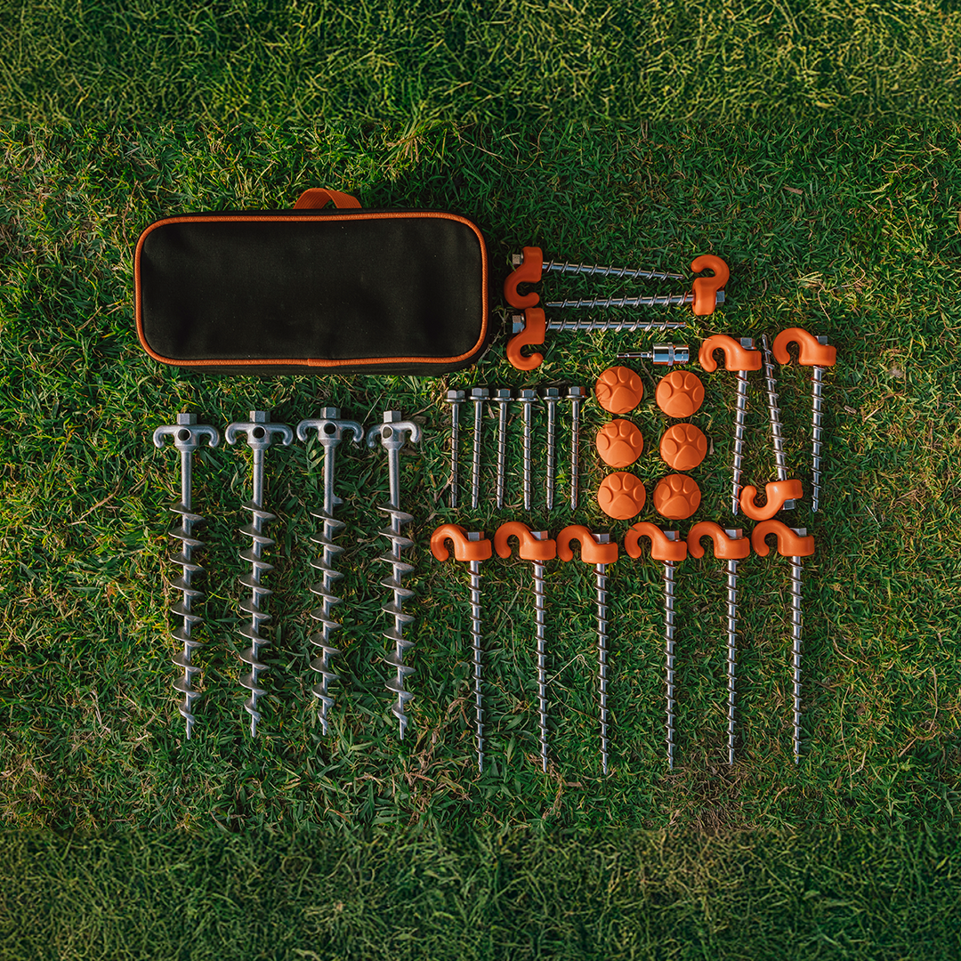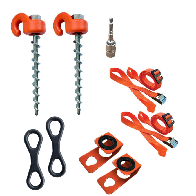 Each kit includes screw-in pegs, tie-down straps, safety springs, and adaptors, giving you all the essentials for a secure setup.