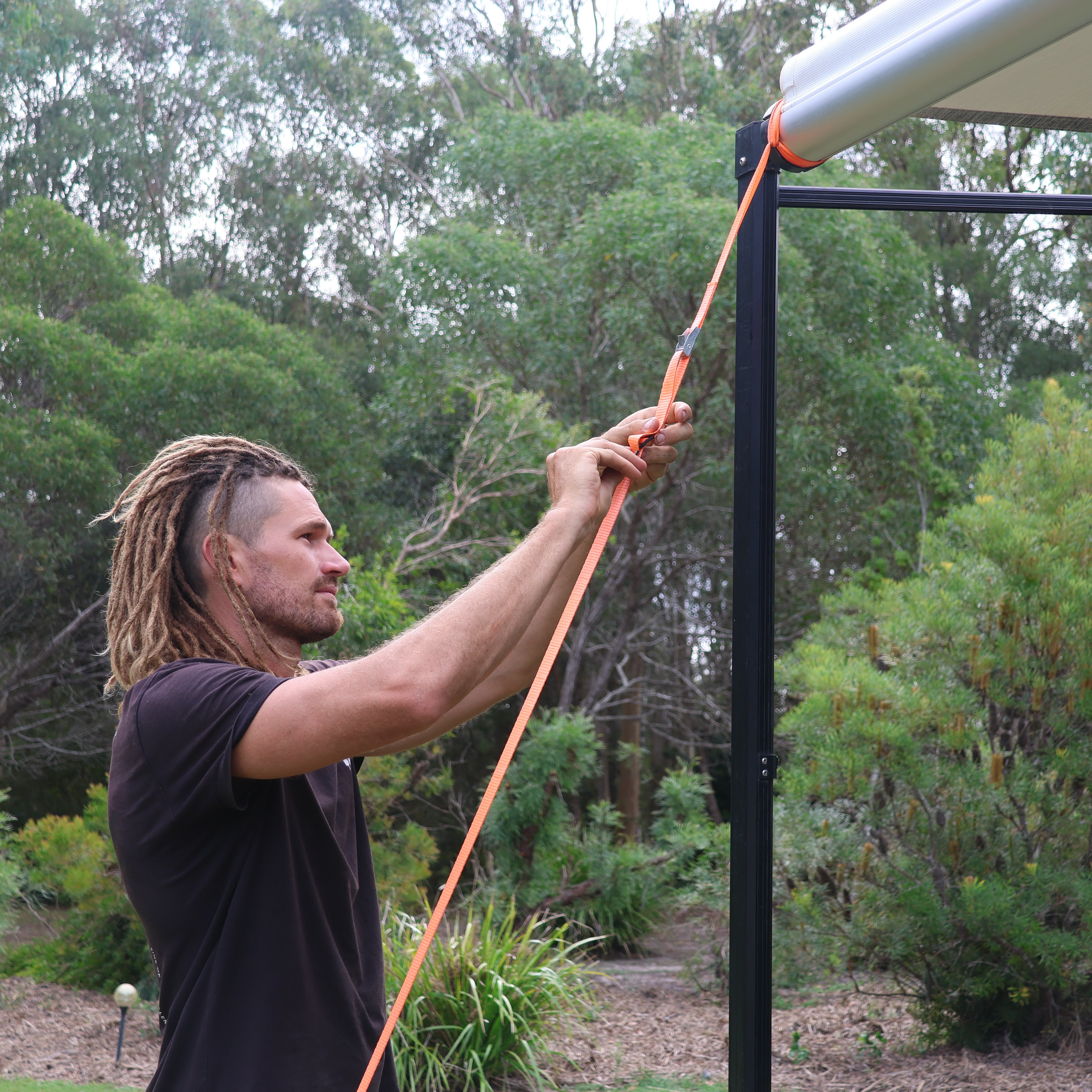 - Unroll your awning, before raising, attach the smaller piece of the tiedown strap to each end of the barrel by placing it around the awning barrel and pass the Cam Buckle through the loop on the other end.